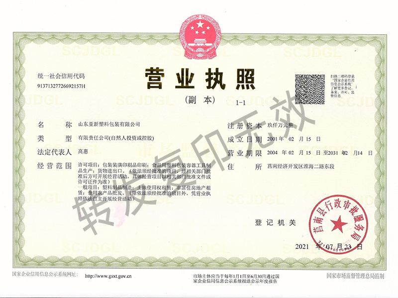 山東亞新塑料包裝有限公司成立于2000年10月,是一家以生產(chǎn)塑料包裝膜、塑料彩印包裝袋為主營(yíng)業(yè)務(wù)的企業(yè)。公司占地47952平方米,車間、辦公樓、宿舍樓建筑面積達(dá)4萬(wàn)多平方米,注冊(cè)資本16000萬(wàn)元,擁有固定資產(chǎn)8474萬(wàn)元,流動(dòng)資金2500萬(wàn)元。