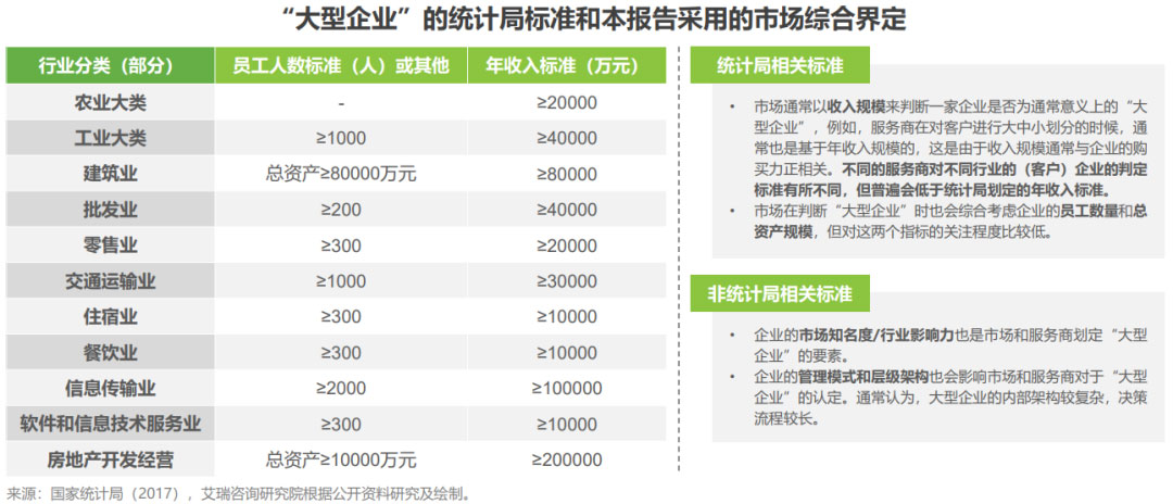 從市場和商務(wù)視角上看,報告所指的“大型企業(yè)”還包括上述指標(biāo)不顯著低于統(tǒng)計局標(biāo)準(zhǔn),且在管理模式、數(shù)字化需求、采購流程等方面具備下圖及報告第三章所示特征的企業(yè)。